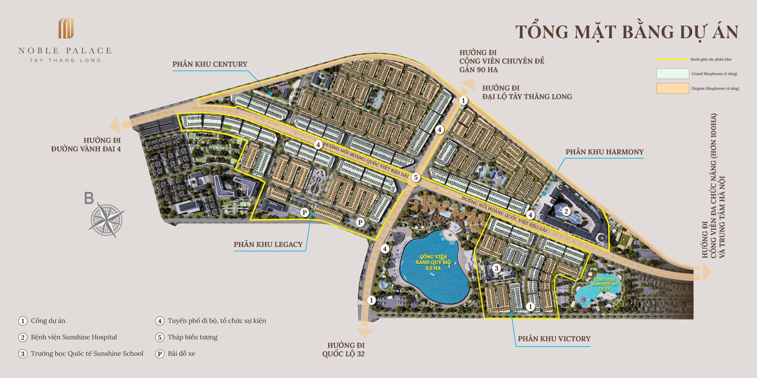 Với quy mô 77 ha, Noble Palace Tây Thăng Long mang phong cách kiến trúc cổ điển châu Âu, lấy cảm hứng từ những giao lộ phồn hoa nơi trời Âu. Dự án được quy hoạch thành bốn phân khu: Legacy, Wonder, Harmony và Victory, mỗi khu mang một dấu ấn riêng về không gian và phong cách sống. Mỗi con phố, mỗi quảng trường tại Noble Palace Tân Lập – Đan Phượng đều được kiến tạo như một điểm đến văn hóa sôi động, hình thành nên trung tâm “All-in-one city” – đô thị không ngủ, vận hành suốt 365 ngày trong năm.