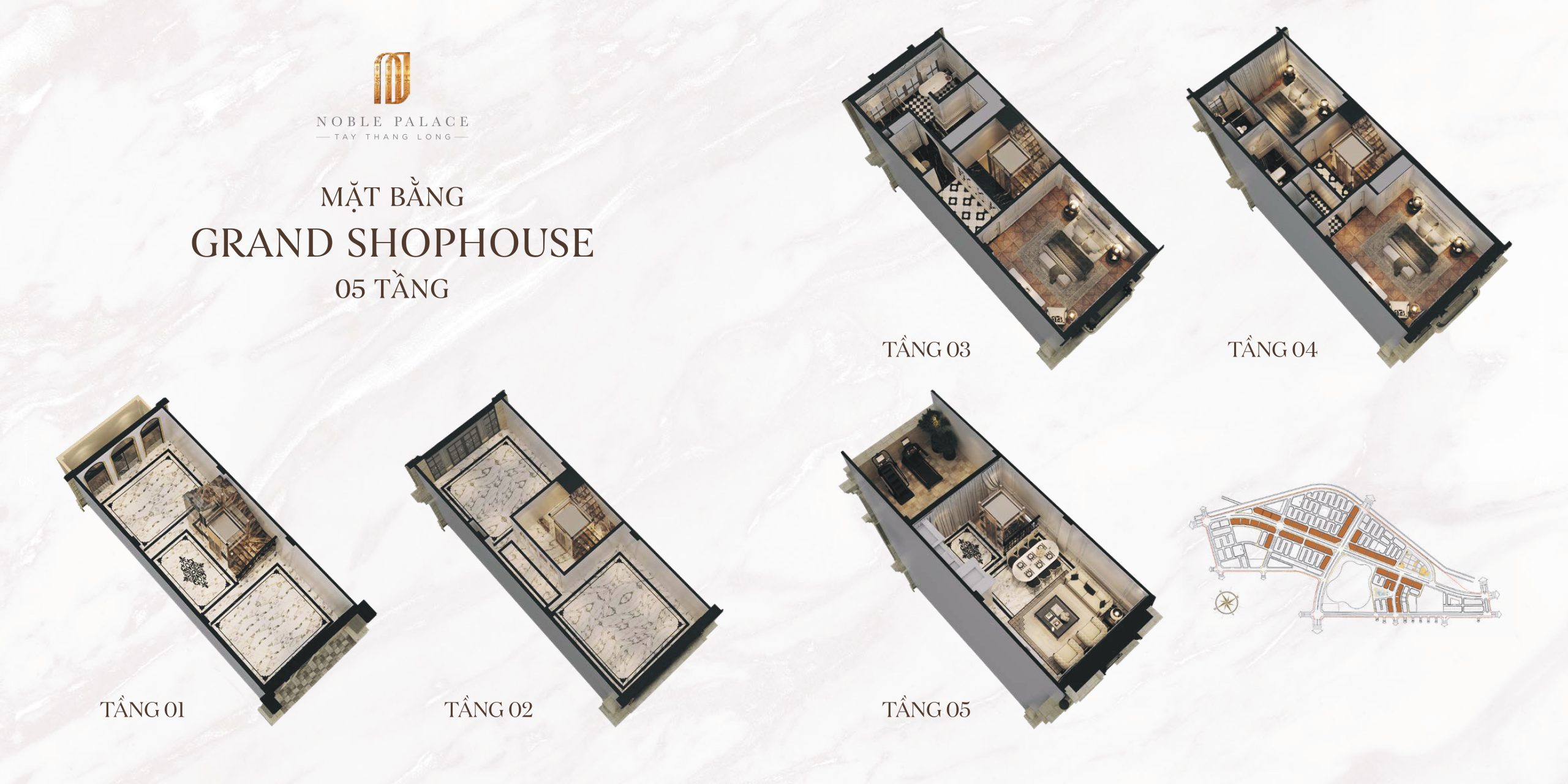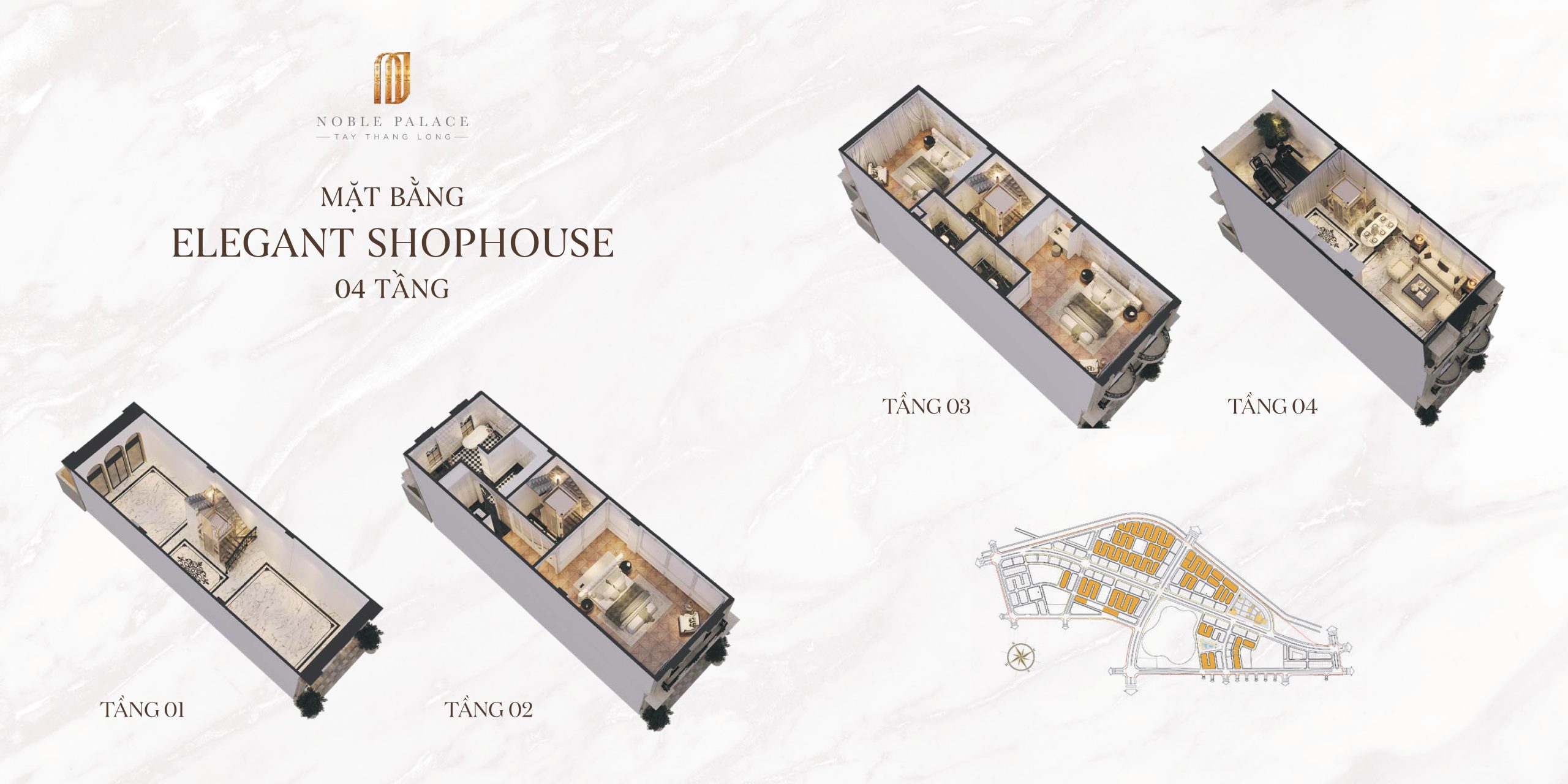 Noble Palace Tây Thăng Long giới thiệu hai dòng sản phẩm chủ đạo – Grand Shophouse và Elegant Shophouse, được kiến tạo theo phong cách Địa Trung Hải sang trọng và tinh tế, hòa quyện giữa vẻ đẹp kiến trúc nghệ thuật và giá trị sống đẳng cấp.