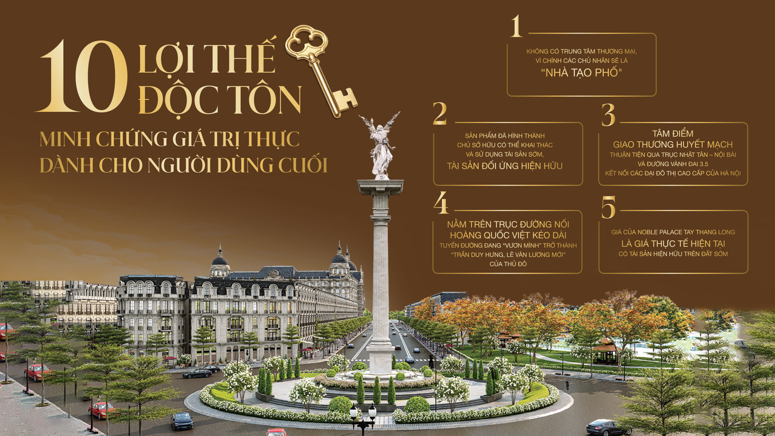Với sự kết hợp giữa kiến trúc đỉnh cao, tiêu chuẩn bàn giao quốc tế và quản lý chuyên nghiệp, Noble Palace không chỉ là nơi an cư lý tưởng cho giới tinh hoa, mà còn là biểu tượng đầu tư bền vững của khu Tây Bắc Thủ đô – nơi hội tụ giá trị sống, thương mại và nghệ thuật trong cùng một không gian.